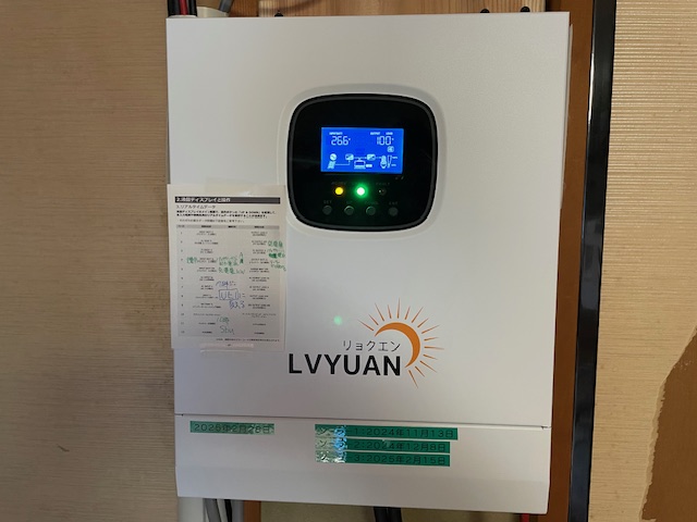 ハイブリッドインバーターとは簡単に説明すると、ソーラーパネルから発電された電気をバッテリー(蓄電池)に充電する為のチャージコントローラーと充電された直流の電気を交流の100Vに変換してくれるインバーターが一つになっている機器です。前回の簡易的な12Vの太陽光発電システムと違い、ハイブリッドインバーターの設置には電気工事士の資格が必要になります。