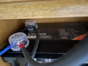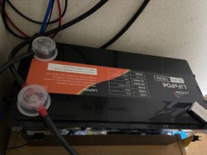バッテリーもハイブリッドインバーターの購入に伴い一新しました。私が購入したのは24V仕様だったからです。さすがに12Vではあんまりです。それまでは12.8V100Ahのバッテリーを2個持っていて、並列に繋ぎ(その時のインバーターが12V仕様だった為)12.8V200Ah2560Whとして使っていました。その2個のバッテリーを直列に繋いで24Vにする事も考えたんですけど、もうちょっと大きい容量にしたいと思い、25.6V100Ahのバッテリーを2個購入し並列に繋ぎ、25.6V200Ah5120Whとする事にしました。下の写真です。別々な写真で分かりにくいですが並列に繋いであります。