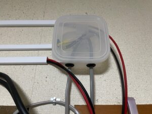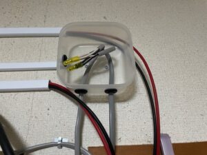 1番右の赤と黒の2本の線がソーラーパネルからの電力の供給です。真ん中ら辺の黒い2本の太そうな線がバッテリーと繋がっている線です。ちなみに私はWCTの22sqのケーブルを使っていますが一般的にはKIVかなと思います。