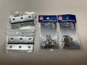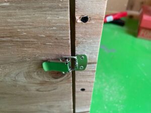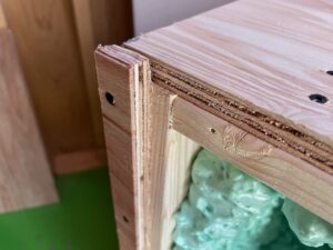 発泡ウレタンを吹き付けた後、扉をつけるのに、丁番とパッチン錠をつける板も両側に貼り、扉を取り付けます。