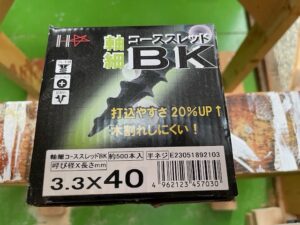 コーススレッドは軸細のを使いました。小屋とかを作るのには細軸は心もとないですがこのくらいの大きさなら充分ですね。下穴無しでも気割れしないしすごく楽です。