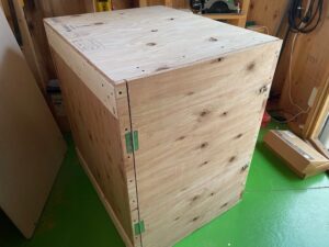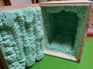 この後、扉をつける前に5面に発泡ウレタンを吹き付けてしまおうと思って、やったのですが・・・1面も持たずに発泡ウレタン1本を使い切ってしまいました・・・最後の動画を見て貰えば分かると思いますが、想像以上にすぐ1本無くなりました。吹き付け方にも失敗がありましたし・・・
