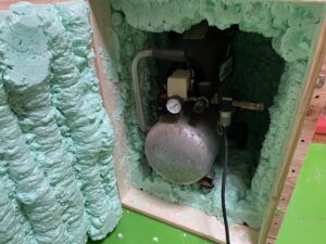 思ったより発泡ウレタンが大きくなりコンプレッサーが入らなかったので固まった発泡ウレタンを切って切って切ってなんとかコンプレッサーが入るまでにしました。