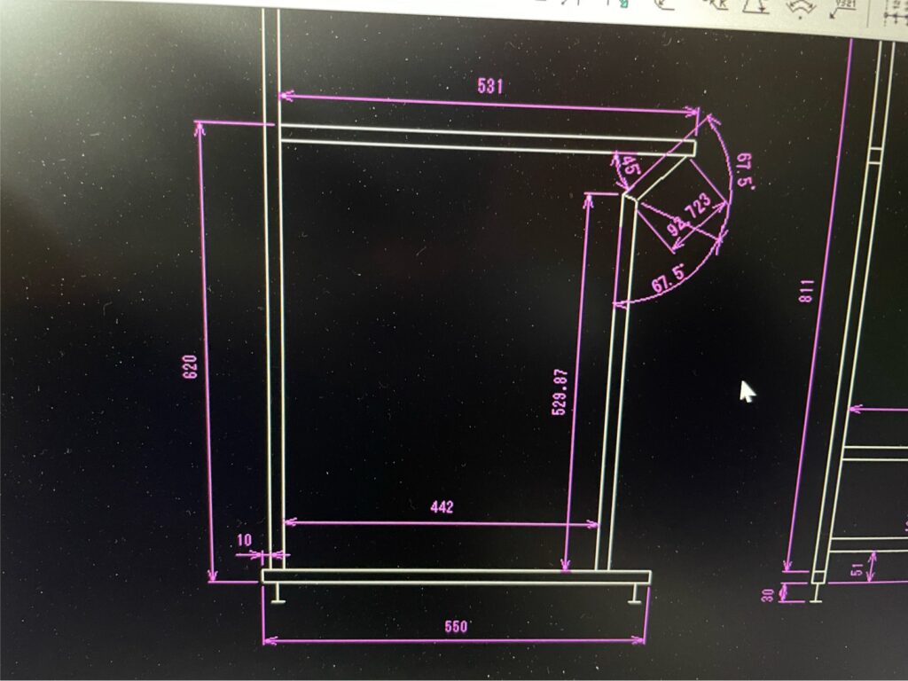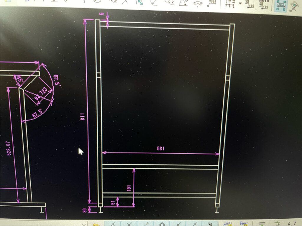 まずはトイレを採寸してどんなサイズで作るかを検討しました。ちょっと角度が分からない所もあったので、今回は仕事で治具等を作る時に使用している無料のCADを使って絵を書いてみました。