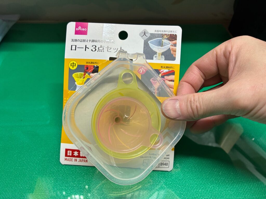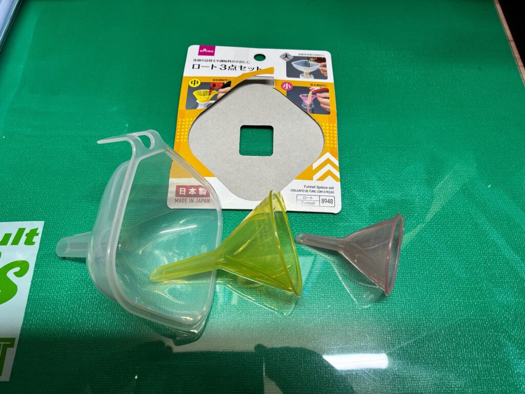 これはダイソーに売っていました。3つのロートのうちの1番小さいピンクのロートだけ使います。